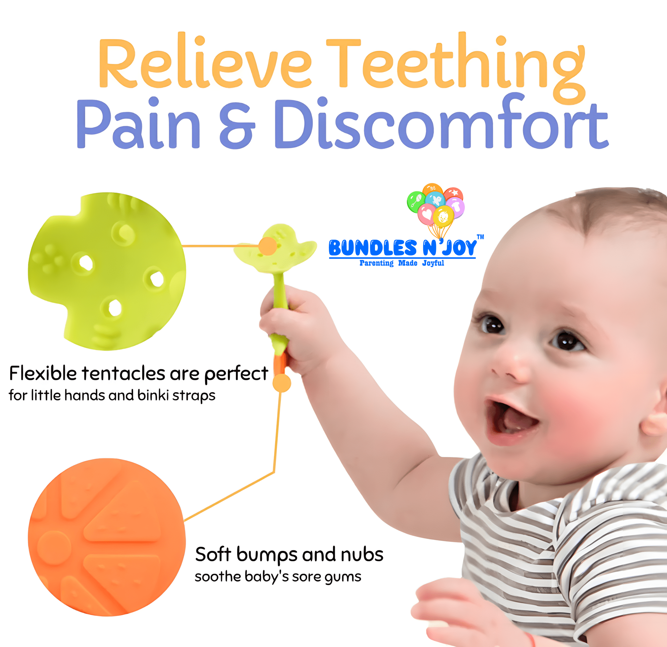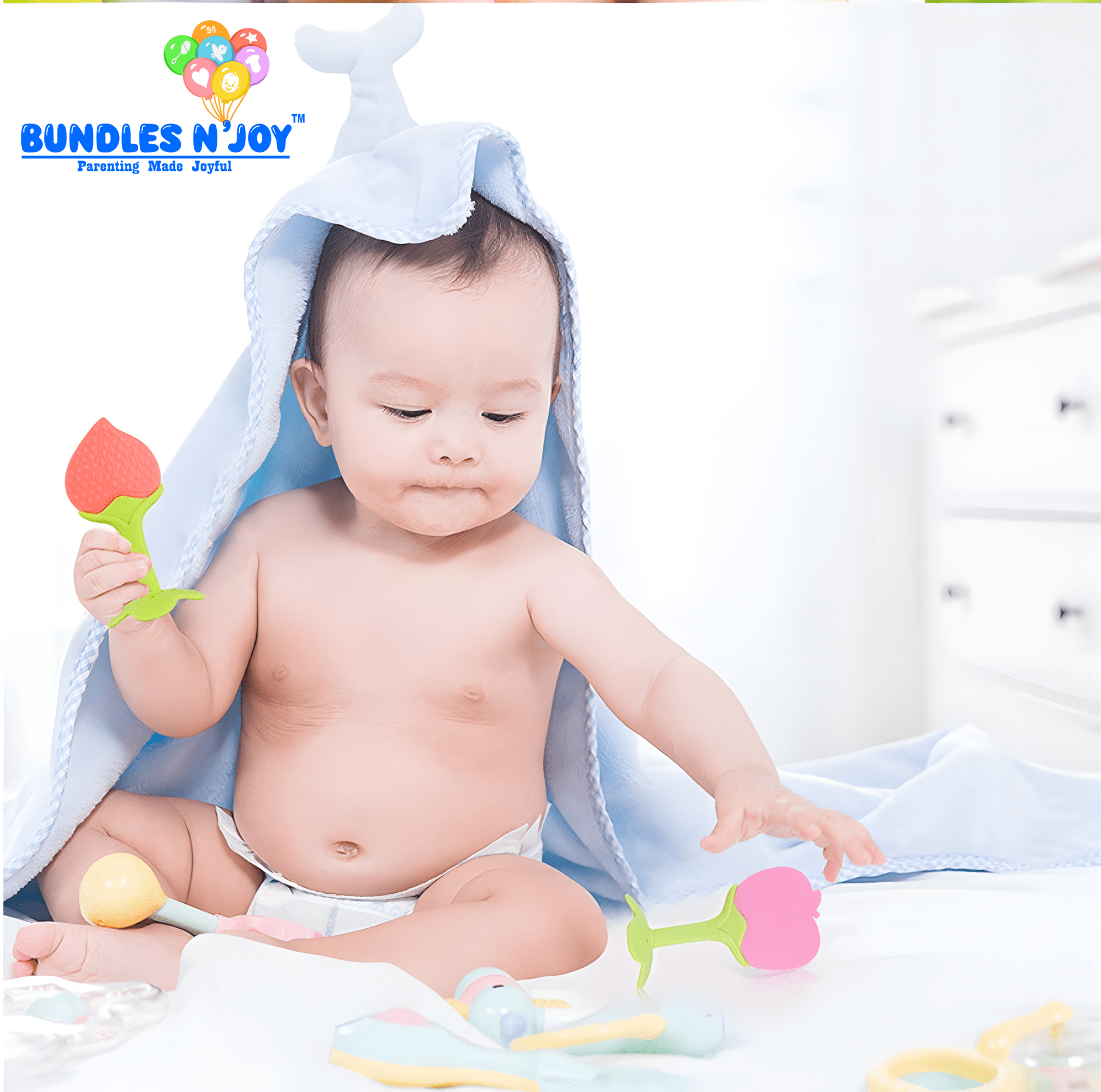 Make teething time easier and joyful for your little one with the TEETHER BOX 3PC Set by Bundles N’ Joy. This pack includes three assorted teethers made from food-grade silicone and high-quality plastic, offering the perfect combination of softness, durability, and safety.